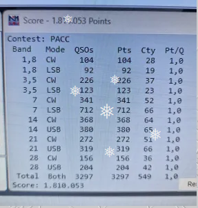 Hoi Ik ben vanaf 10:30 in HvH voor de laatste loodjes. Gisteren zijn 3 setjes klaar gezet, de contest recorder loopt mee. Ik moet alleen nog even de F-toetsen juist instellen. In shack 2 en 5 is een headset aanwezig (Heil) met een werkende microfoon Voor shack 3 dient er nog een headset te komen met mic. Er ligt een verloop van heil naar K3 Misschien hoeven we niet met headset te slepen. PI40CC, ik heb nog niets vernomen van RDI. Een test in CW laat zien dat deze call door een hoop skimmers als niet geldige call wordt herkend en daardoor niet op RBN getoond wordt. Ook skimmer PI4CC stuurt PI40CC niet door naar RBN Een test van uit Vlaardingen met PC2A en PI40CC RBN - Reverse Beacon Network <https://reversebeacon.net/main.php?rows=100&max_age=20,hours&spotted_call=pc2a&hide=distance_mi> (pc2a) RBN - Reverse Beacon Network <https://reversebeacon.net/main.php?rows=100&max_age=20,hours&spotted_call=pi40cc&hide=distance_mi> (pi40cc) Ik ga niet meer bellen met de RDI en laten gewoon PI4CC gebruiken. (mee eens?) PI4COM heeft in 2025 de volgende qso's maakt SSB is de bovenliggende mode. Met onze CW crew wordt dat een aandacht puntje :-) Ik stel voor dat de op 10 en 15M beginnen met antennes oost Mocht 1 van deze 2 banden niet lopen gaan we gelijk naar 20m Zie ook PACC 2025 at PI4COM – PI4COM Contestgroup Oude Maas <https://www.pi4com.nl/?p=31466> Dan een paar Win-test tips: Je mag aan self spotting doen volgende de regels. In SSB zodra je ergens gaat zitten type PI4CC in het log veld en druk je op ALT + F3 Zo kan je PI4CC spotten met bij behoorde frequentie In de band map staan spots die relevant zijn. Er staan stations in die of gemeld zijn door PA stations en dus waarschijnlijk mee doen in de PACC. PA stations die gespot worden en spots waar in de info PACC staat. Zorg er voor dat je deze spots werkt en dat de band map leeg is Ieder puntje is er 1 en vaak zijn de stations snel weer weg! Verander de F toesten niet. Deze staan zo ingesteld dat skimmer het herkend. Soms denk je wat een lange cq, maar het is nodig. Gebruik de escape toets om het eventueel af te kappen :-) Als er van shack wordt gewisseld neem het station naam mee waar van je vanaf komt! Er zijn twee namen R1 en R2. Je kan het aanpassen via ALT + Y Het window voor de qso rate wordt in gesteld naar de band waar op wordt gewerkt; Voor een hoge score dient de 10 last qso boven 60 te liggen Tot zo ver Peter