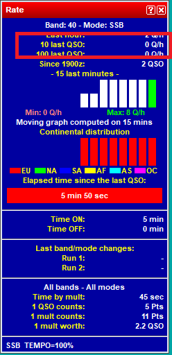 Het window voor de qso rate wordt in gesteld naar de band waar op wordt gewerkt; Voor een hoge score dient de 10 last qso boven 60 te liggen